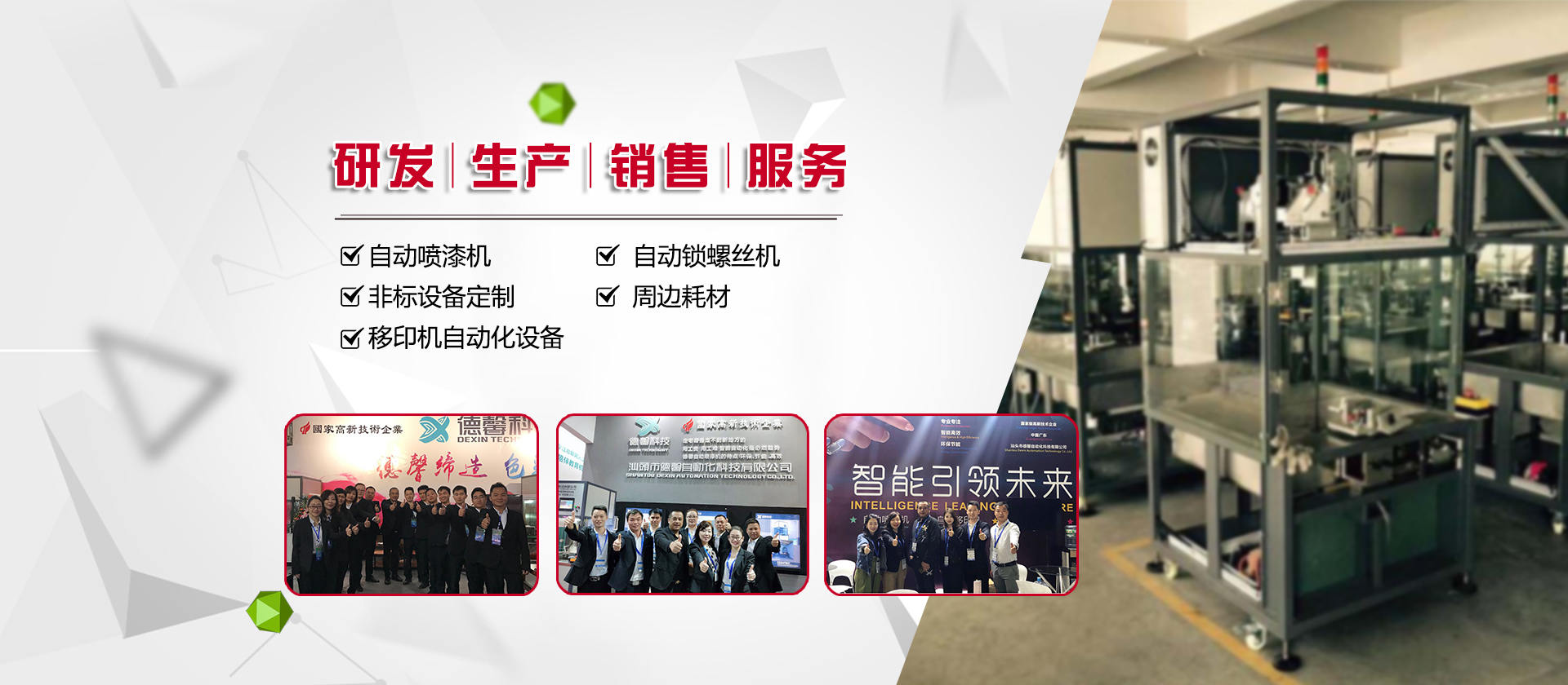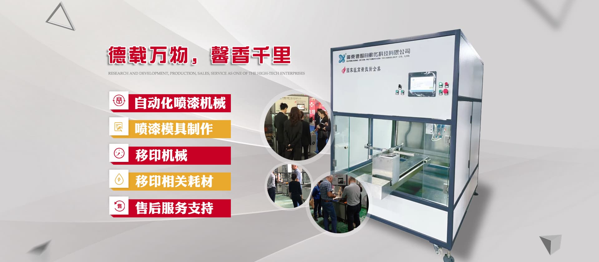 德馨科技創(chuàng)立以來,以改變噴印業(yè)傳統(tǒng)手工生產(chǎn)模式為目標,產(chǎn)品開發(fā)制造堅持以“環(huán)保、智能”為理念,為企業(yè)的生產(chǎn)環(huán)境、人力成本、生產(chǎn)效率等提供更為優(yōu)良的服務和技術(shù)支持。公司研發(fā)產(chǎn)品主要有自動化噴漆機械、噴漆模具制作等;生產(chǎn)銷售移印機械及移印相關(guān)耗材,包括菲林設計輸出;鋼板制作、移印膠頭制作、定位制作及周邊配件耗材并提供完善的售后服務支持。